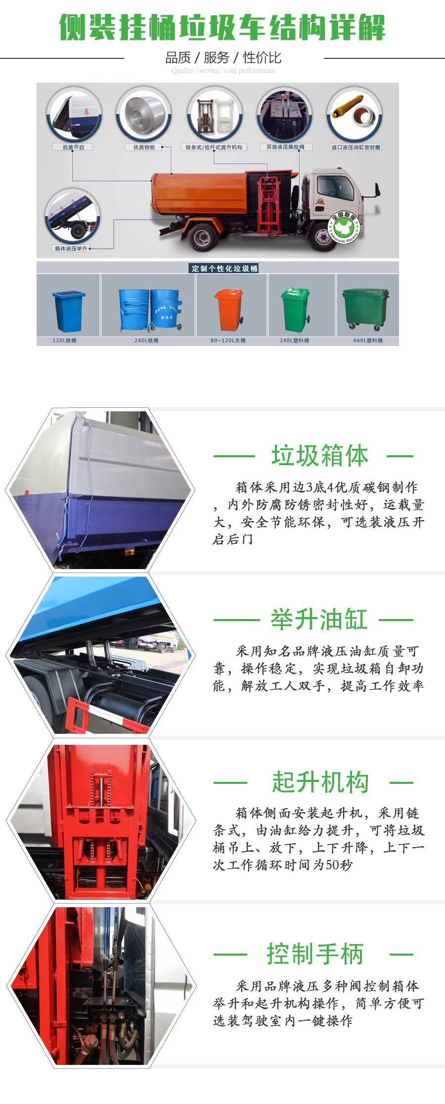 自動舉升垃圾桶倒入垃圾,提升機頂部帶機械翻蓋,箱體底部雙液壓舉升自卸,箱體后部設(shè)有擋水槽,尾部裝有橡膠密封條,防污水滴漏。 | ||