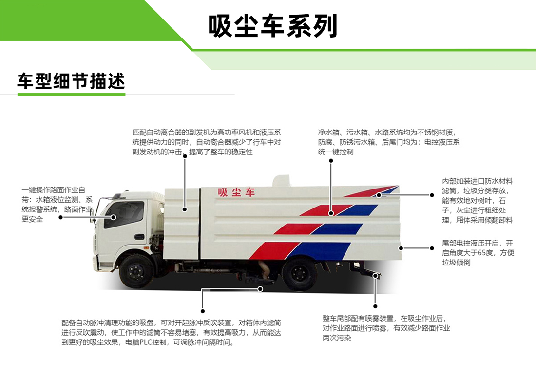 東風(fēng)小多利卡5方吸塵車(chē)專(zhuān)用配置:塵箱:4立方米,水箱:1立方米;中置吸盤(pán)、江鈴五十鈴副發(fā)動(dòng)機(jī)、施耐德控制開(kāi)關(guān)、海普瑞斯電磁閥組、無(wú)級(jí)變速自動(dòng)離合器、免維護(hù)離心式風(fēng)機(jī)、高精度垃圾箱過(guò)濾系統(tǒng)(最高可達(dá)0.5微米),不銹鋼垃圾箱、進(jìn)口脈沖閥、垃圾箱舉升自卸、尾部LED箭頭燈、車(chē)尾霧狀噴水潤(rùn)濕功能、倒車(chē)影像、手動(dòng)泵應(yīng)急系統(tǒng)。
